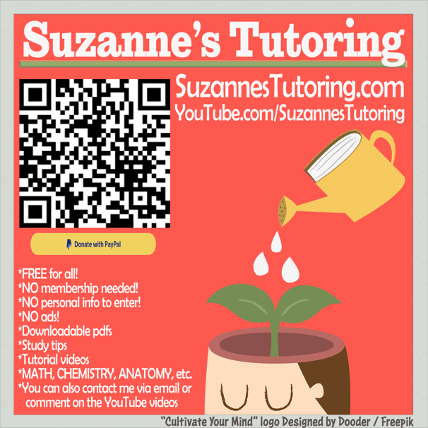 If you have any requests for new videos on other subjects or concepts, I'm happy to help - but it works best if you can be specific. The easiest way is to email Suzanne@SuzannesTutoring.com and attach a picture or screenshot of exactly what you are stuck on or need some clearer explanations about for class. I won't do a video using that specific problem or question (because if it's homework I don't want you to get accused of cheating), but I will come up with a similar problem as an example and show how to do it at some point during the new video. This is SO much better than just sending me a general request like "Can you do a video explaining organic chemistry?"
